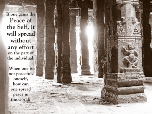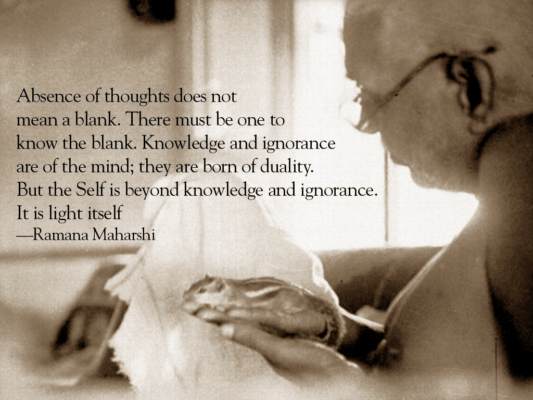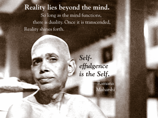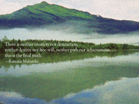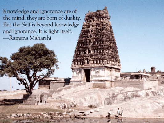Ramana Maharshi’s teachings reflect the philosophical viewpoint of Advaita (not two). This profound view of the nature of Reality removes the distinction between subject and object, seer and seen, one’s self and the world. To the awakened sage, the world is none other than the Self.