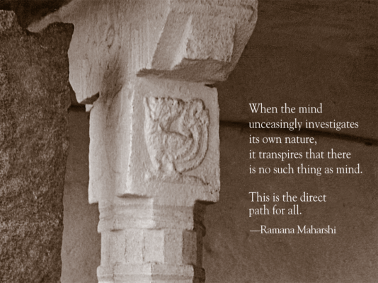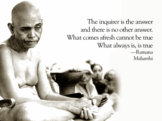 Ramana Maharshi continually asks us to return to the Source of our true Being. The simple and direct approach he taught eliminates the need to undertake a path of self-improvement since wherever we go the Self is always present. There are no special requirements for investigating “who we really are,” but he reminds us that earnestness of purpose certainly facilitates the opening of our hearts to the infinite Self.